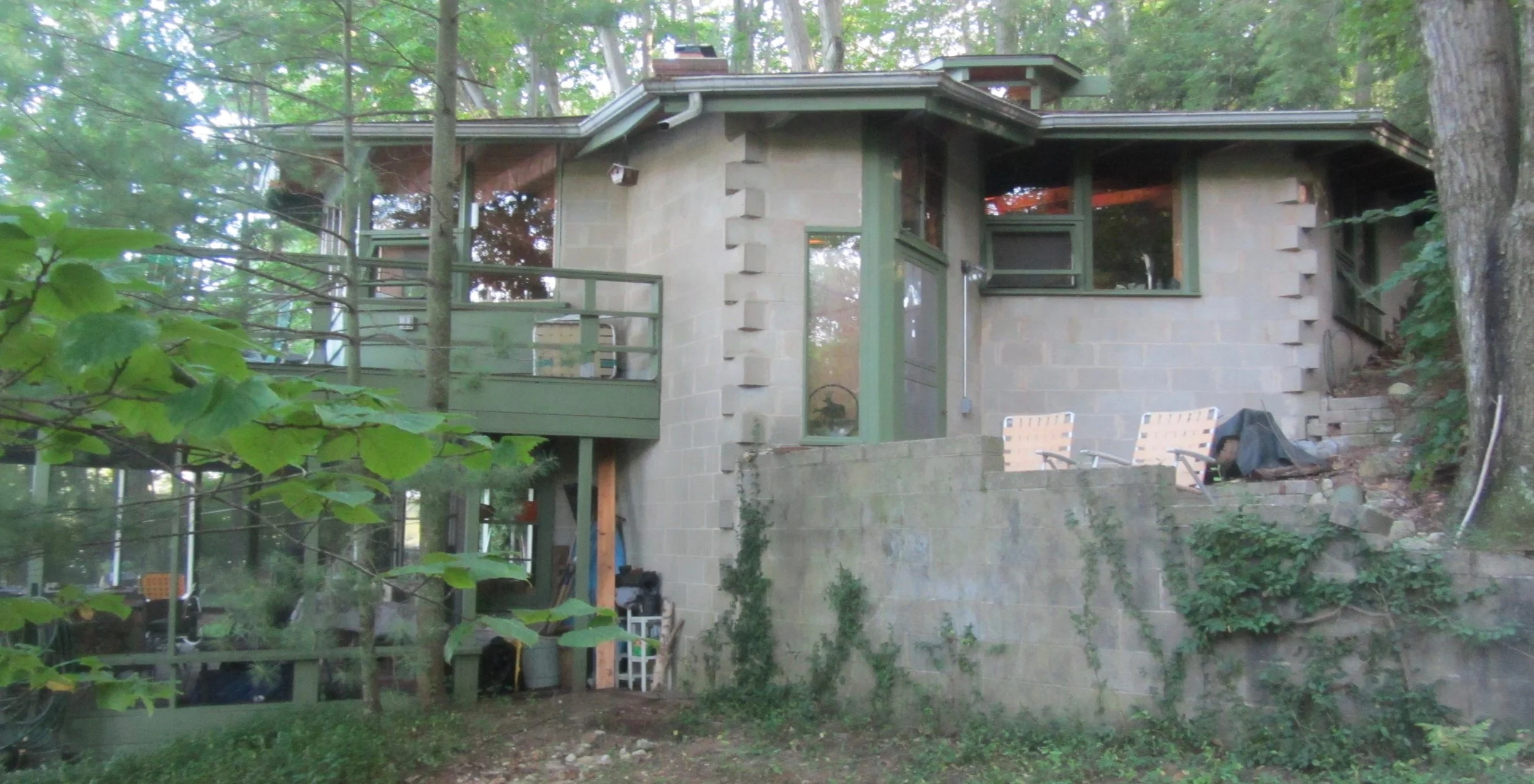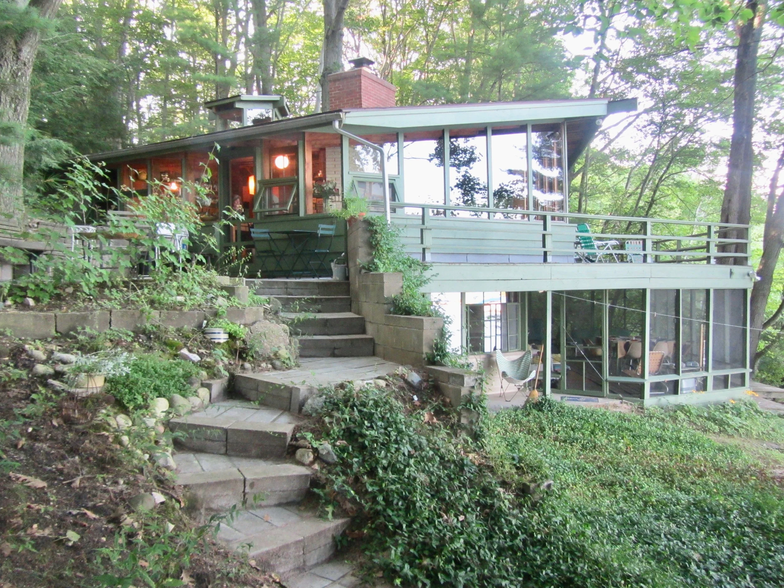 “Ambition’s Retreat” is John and Julie Stivers unique mid-century modern cottage on Stony Lake. The setting is Turtle Bay, aptly named for the many turtles that sun themselves on the turtle floats John constructs. After you park your car above and behind the cottage you make your way down the stairs to the two-level cottage set snugly into the elevated site. Chicago architect J. Chamberlin of Des Plaines, Illinois designed the cottage around 1959-60, according to the blueprints. The Stivers are only the second owners. The original owner was Elliot Dodge of Chicago and California, known as Ace. Located on a two-track road surrounded by the woods, the pretty cottage is snugged into the elevated site, and once you have arrived at the house, you are not done with steps. Another set of curving stone steps takes you down to the water.