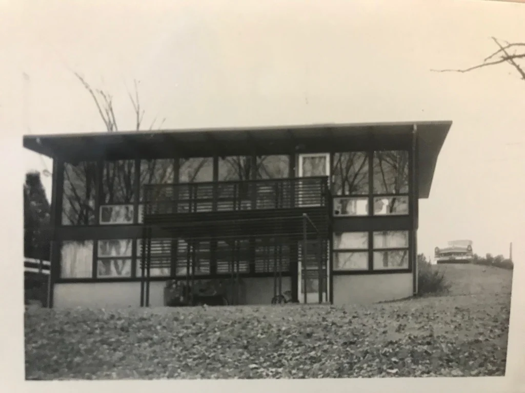 The soil on this site was challenging. Post perched his bi-level house, with a full walkout basement, back as far as he could on the edge of the steep ridge. He designed a two-story window wall on the back of the house to take full advantage of the views of what is today the Maryland Estates Association nature preserve. He added a narrow balcony/deck that had decorative horizontal boards. He sided the exterior with vertical California redwood. He designed the front of the house with a low, you might say understated, horizontal profile and a nearly flat tar and gravel roof (the pitch has a 1 to 12 ratio). A half-circle drive curves in front of a set of awning windows and ends in a California-style carport. The carport is of course, a functional space, but it’s a design element too with decorative redwood boards that echo the back balcony. Remarkably, past owners have resisted the urge to replace it with a garage. An early black and white photo captures the original design.