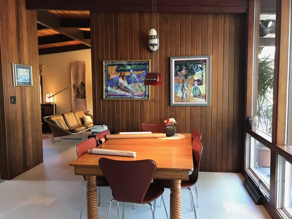This house has been well-maintained. Although the window wall is original, it has been updated with newer glass doors, wood surround and a new glass transom. Against that wall is a lovely library style table with carved legs paired with modern plywood chairs, and on the east wall is a seating group facing a large shelving system displaying books and media. Opposite the windows is the interior full-height brick fireplace wall with cozy seating.